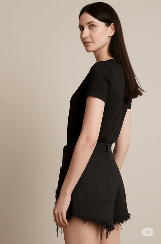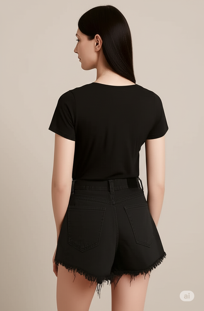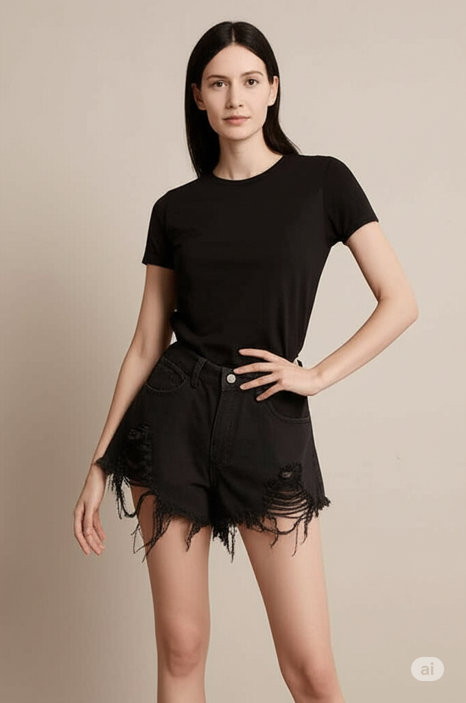 Step into effortless cool with these impeccably designed black denim shorts, a true staple for any contemporary wardrobe. Crafted from premium, soft-touch denim, these shorts boast a flattering high-waist fit that accentuates your silhouette, offering both comfort and style. The classic five-pocket design ensures practicality, while the true star of the show lies in their artfully distressed finish. Featuring strategic rips and tears, along with a raw, frayed hemline, these shorts exude an edgy, lived-in vibe that speaks volumes about your personal style. The deep black wash provides a versatile foundation, making them incredibly easy to pair with anything from a simple white tee for a casual daytime look to a chic blouse for an elevated evening ensemble. Whether you're heading to a festival, a beach day, or just a relaxed weekend outing, these black denim shorts are designed to turn heads and keep you comfortable all day long, proving that comfort and cutting-edge fashion can indeed go hand-in-hand.