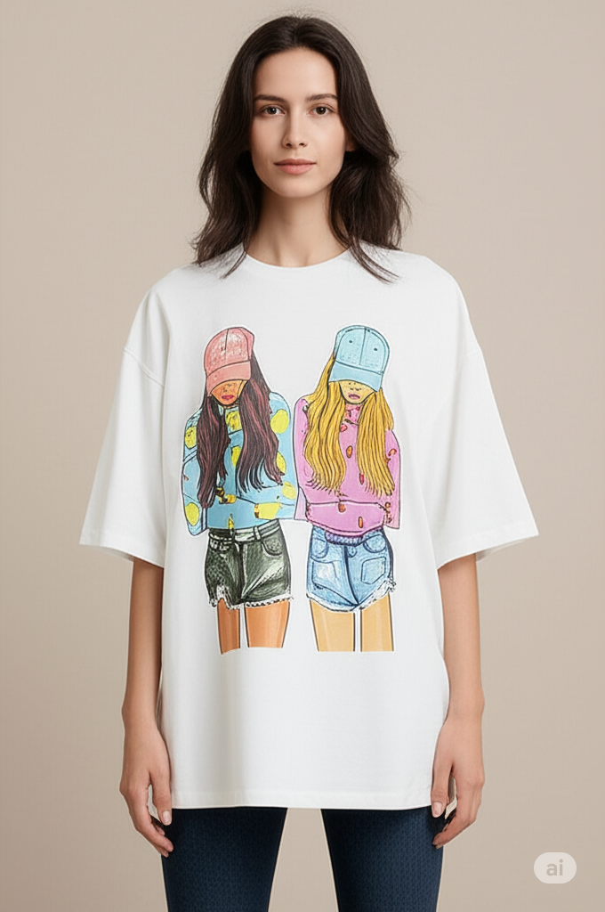 Meet your new favorite oversized tee, showcasing a vibrant and playful graphic of two fashion-forward cartoon girls! This "Free Size" t-shirt isn't just about comfort; it's about expressing your fun-loving personality. Whether you choose the crisp white or the refreshing light blue, the detailed artwork pops, adding a unique touch to your casual ensemble. Embrace the relaxed fit and soft feel, perfect for expressing your unique style with ease and confidence.