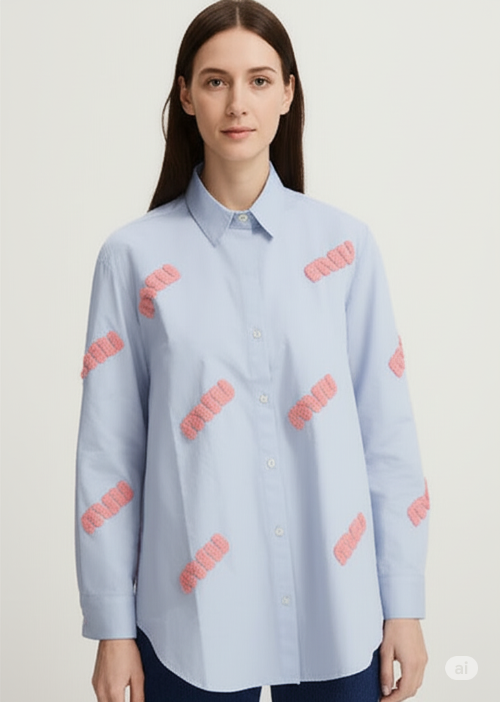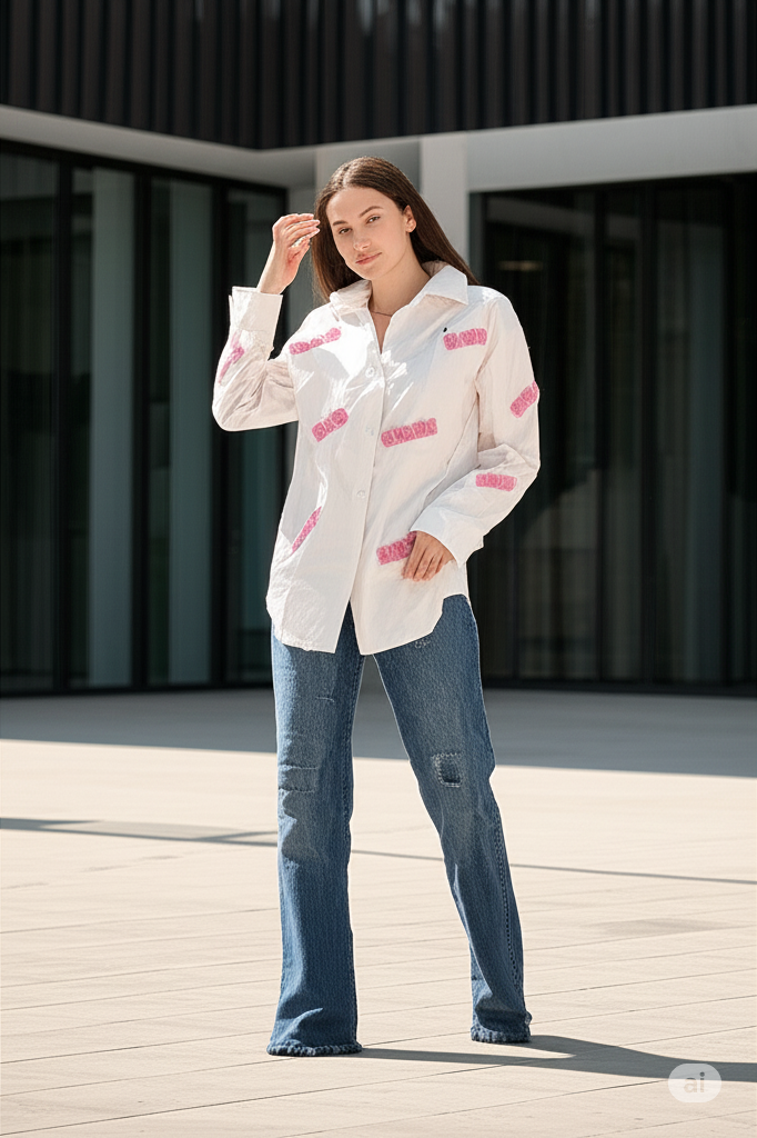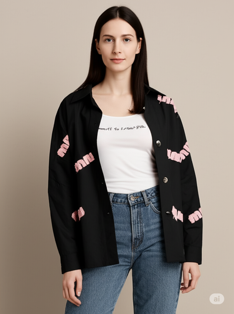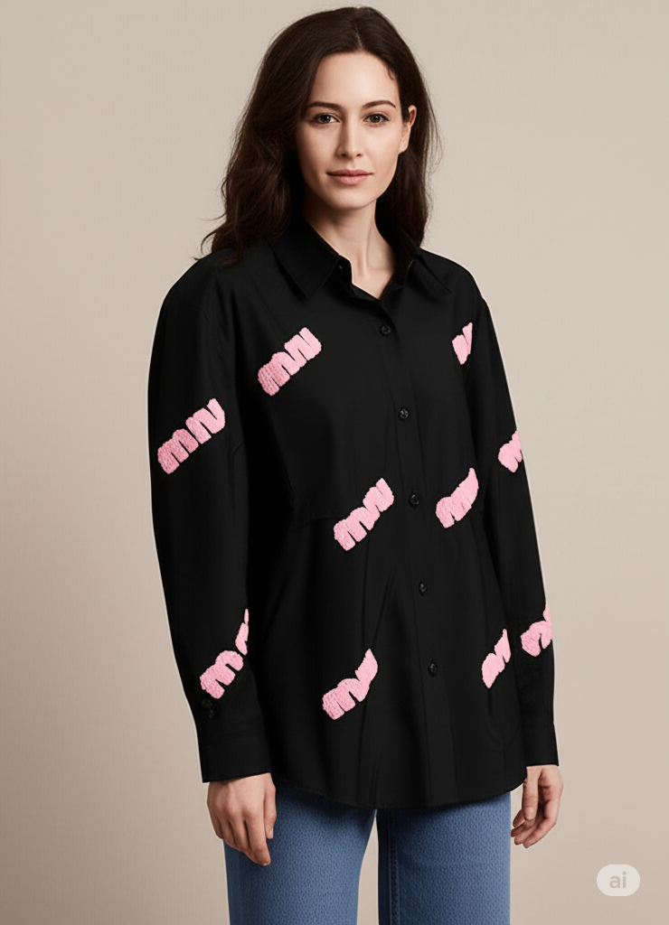 Elevate your casual chic with this striking black long-sleeved shirt with white spaghetti, a true statement piece that effortlessly blends playful charm with sophisticated style. Crafted from a high-quality, breathable fabric, this shirt promises both comfort and durability for everyday wear. What truly sets it apart are the vibrant, textured pink "miu miu" letterings artfully scattered across the entirety of the garment, creating a captivating visual rhythm. These plush, embroidered details add a delightful tactile dimension and a pop of unexpected color against the classic black backdrop. The relaxed yet tailored fit ensures a flattering silhouette for various body types, offering versatility for both dressed-up and laid-back ensembles. Featuring a classic collar and a full button-down front, this shirt can be styled in multiple ways – buttoned up for a polished look, or left open over a camisole for a more relaxed, layered aesthetic. The long sleeves with buttoned cuffs allow for easy adjustment, whether you prefer them worn down or stylishly rolled up. Perfect for making a bold fashion statement, this "miu miu" adorned black shirt is an essential addition to the wardrobe of anyone who appreciates unique design and a touch of playful luxury.