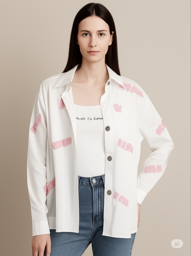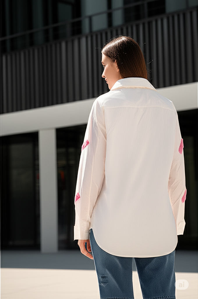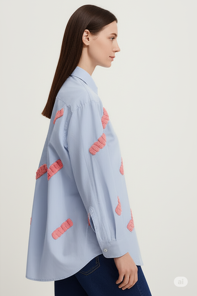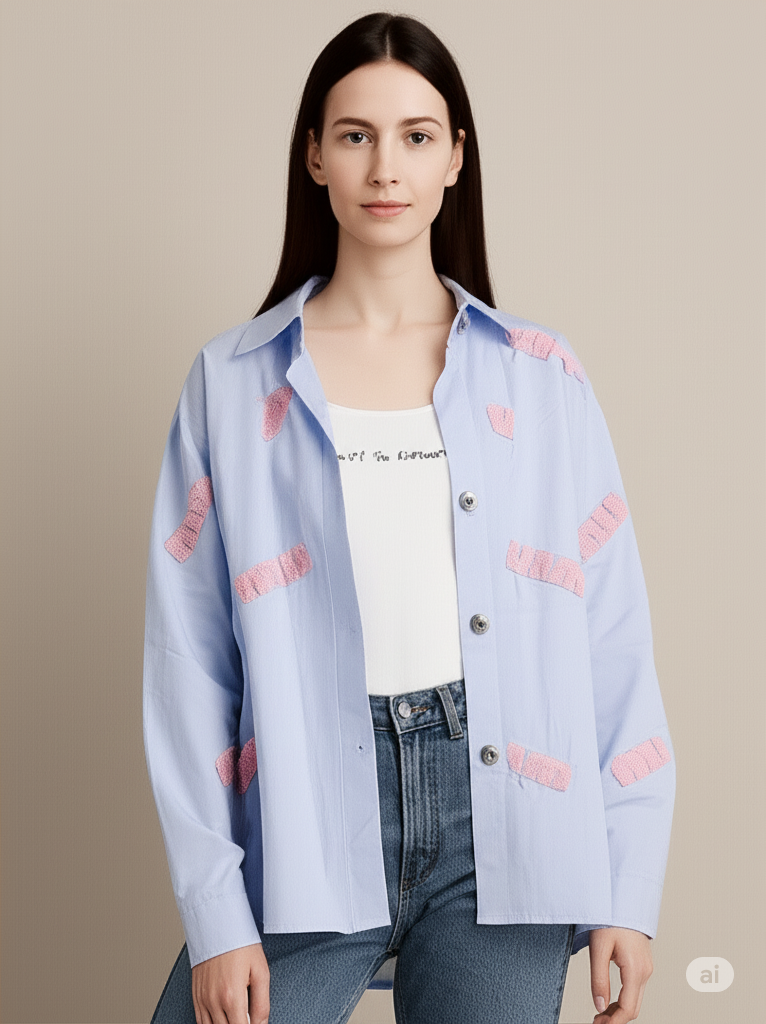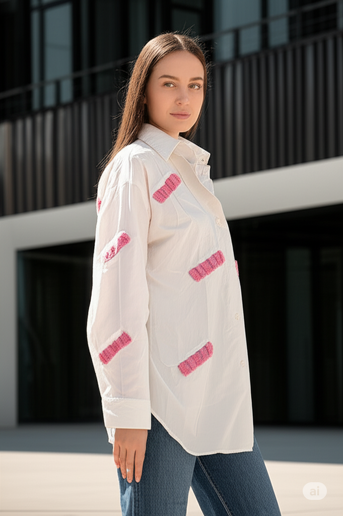 Elevate your casual chic with this striking black long-sleeved shirt with white spaghetti, a true statement piece that effortlessly blends playful charm with sophisticated style. Crafted from a high-quality, breathable fabric, this shirt promises both comfort and durability for everyday wear. What truly sets it apart are the vibrant, textured pink "miu miu" letterings artfully scattered across the entirety of the garment, creating a captivating visual rhythm. These plush, embroidered details add a delightful tactile dimension and a pop of unexpected color against the classic black backdrop. The relaxed yet tailored fit ensures a flattering silhouette for various body types, offering versatility for both dressed-up and laid-back ensembles. Featuring a classic collar and a full button-down front, this shirt can be styled in multiple ways – buttoned up for a polished look, or left open over a camisole for a more relaxed, layered aesthetic. The long sleeves with buttoned cuffs allow for easy adjustment, whether you prefer them worn down or stylishly rolled up. Perfect for making a bold fashion statement, this "miu miu" adorned black shirt is an essential addition to the wardrobe of anyone who appreciates unique design and a touch of playful luxury.