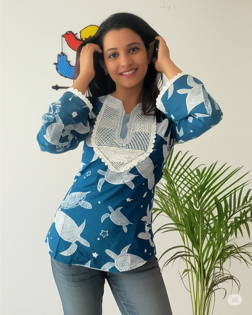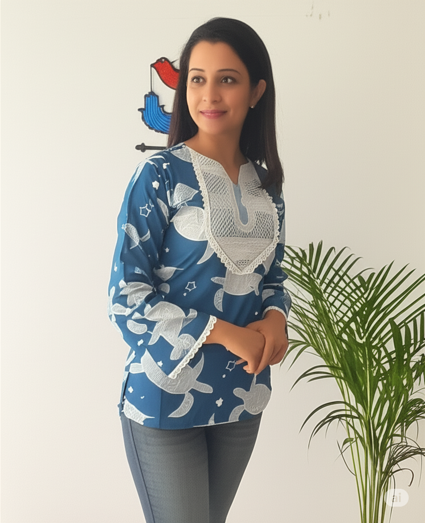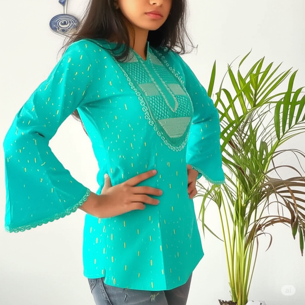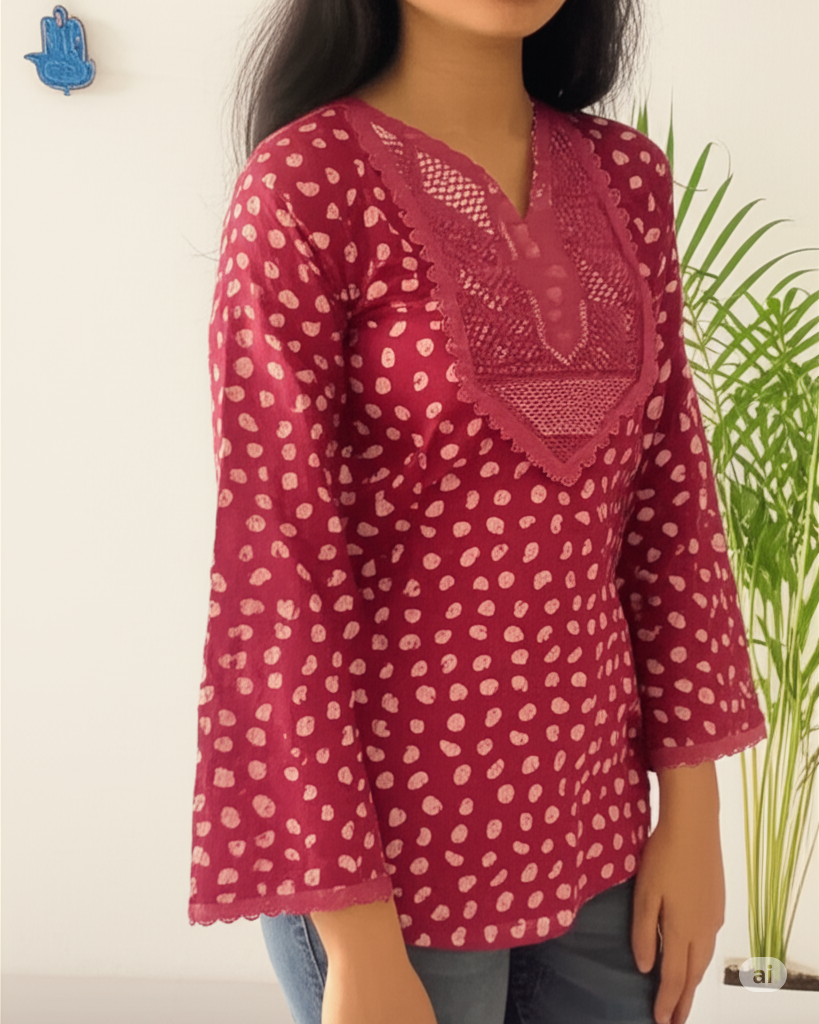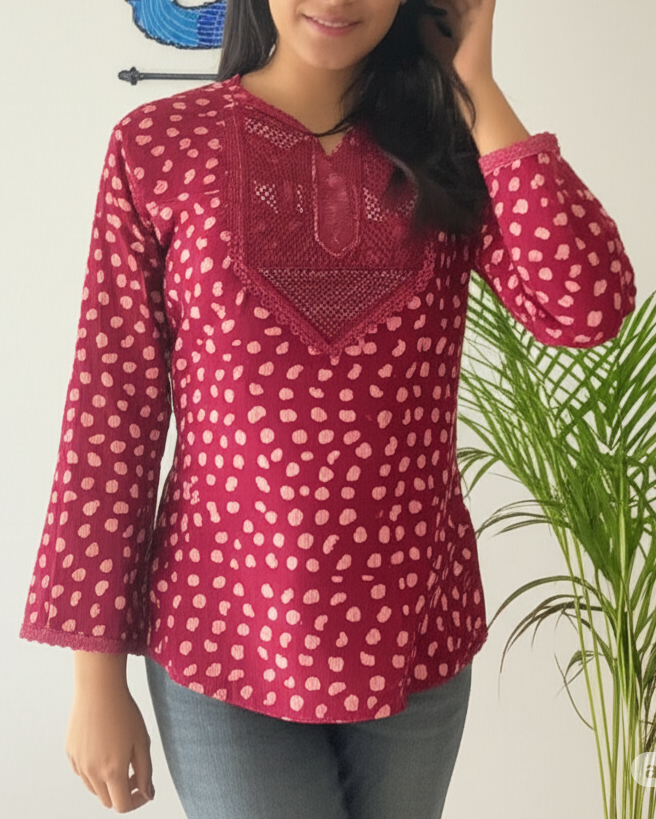 Elevate your casual wardrobe with this elegantly designed kurti, a perfect blend of style and comfort. Featuring a charming polka-dot print, this piece is crafted from a soft, breathable fabric that drapes beautifully. The V-neckline is accentuated with intricate lace and geometric detailing, adding a touch of sophistication. With its three-quarter length bell sleeves finished with delicate lace trim, this kurti offers a relaxed yet stylish fit for any occasion. Pair it with your favorite jeans or leggings for a effortlessly fashionable look.
